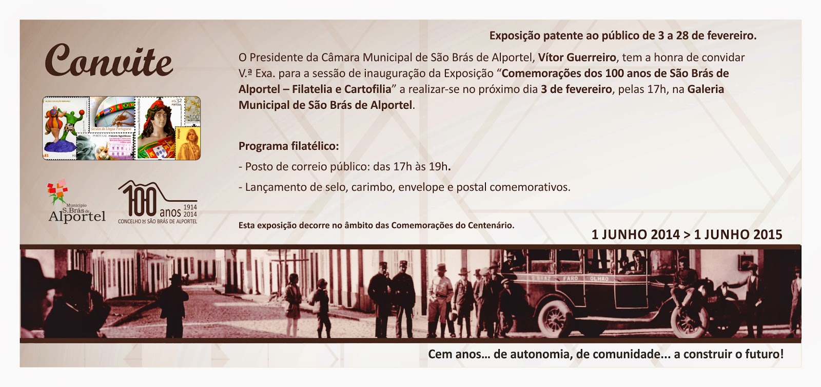 informamos que na próxima terça-feira (3 de Fevereiro) dia de São Brás será inaugurada na Galeria Municipal de São Brás de Alportel uma exposição de de filatelia e cartofilia com o intuito de assinalar filatelicamente o centenário da elevação de São Brás de Alportel a Município.